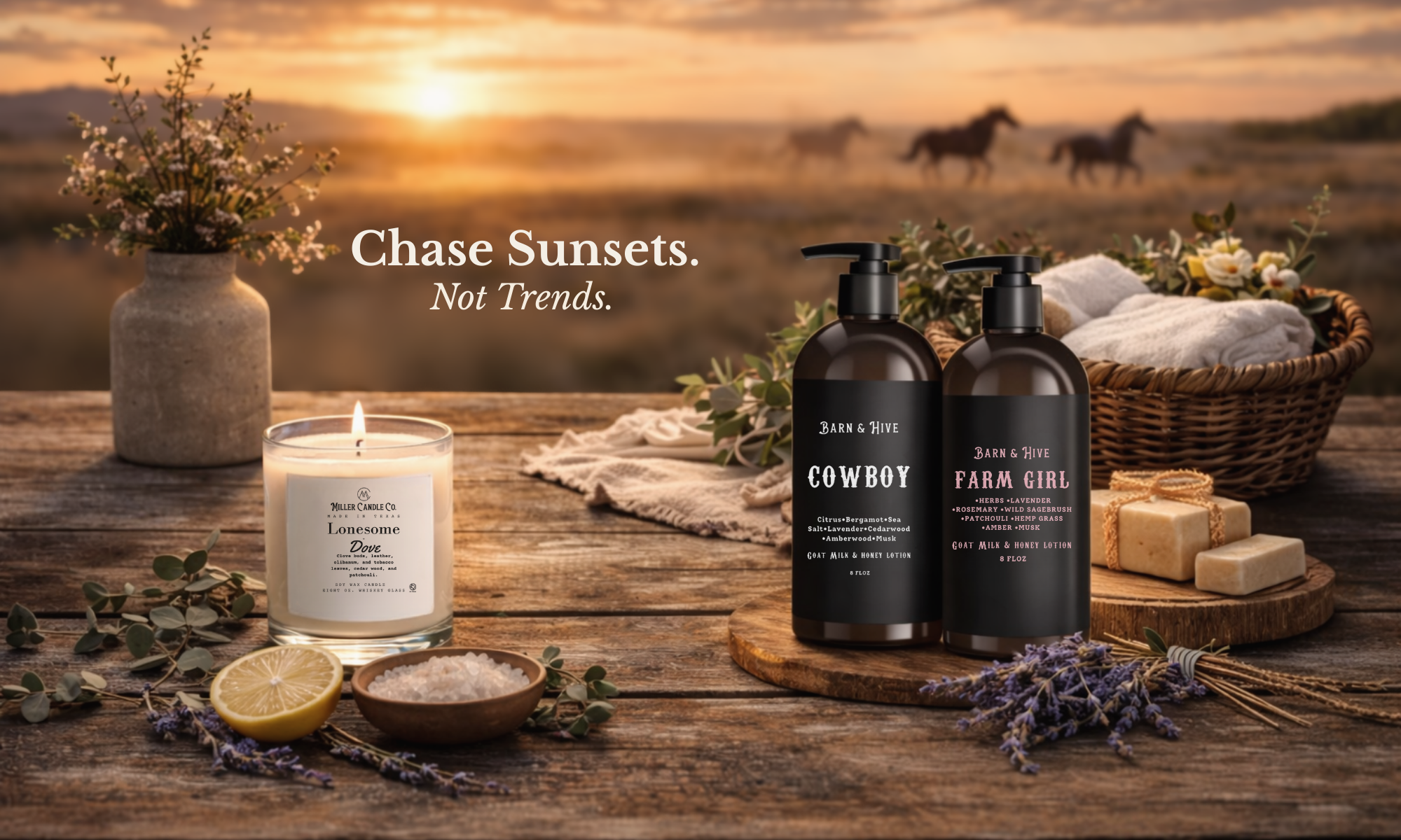 Welcome to Miller Candle Co., home of three Texas-crafted brands — Miller Candle Co., Barn & Hive, and Dry Creek Trading Co. From hand-poured candles to small-batch body care and Western-inspired goods, everything we make is rooted in craftsmanship, story, and the simple beauty of everyday living.